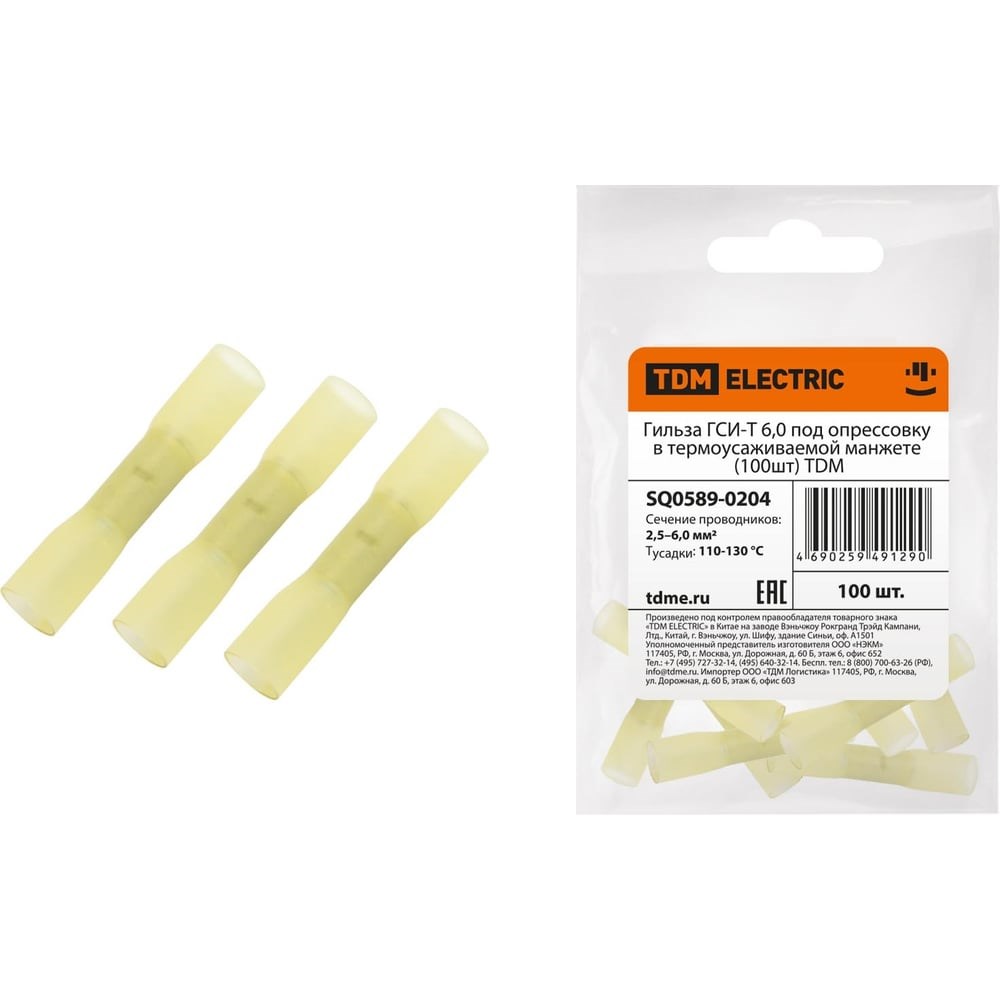 Дополнительные технические характеристики гильзы TDM ELECTRIC ГСИ-Т 6,0 под опрессовку, в термоусаживаемой манжете, 100 штук SQ0589-0204: Предназначены для оконцевания опрессовкой медных проводов и последующего крепежа наконечников к клеммам электрического оборудования на основе винтовой фиксации; для соединения встык медных проводов методом опрессовки. Благодаря заваренному стыковому шву на трубной контактной части, ориентация наконечника в матрицах инструмента не имеет значения. Поперечные засечки на внутренней поверхности трубной части наконечников увеличивают механическую прочность соединения с жилой. Стопорная высечка, расположенная по центру гильзы, определяет глубину захода провода в соединитель. Снятые по краям гильзы фаски облегчают заведение провода. Термоусаживаемая трубка с клеевым слоем обеспечивает полную герметичность и антикоррозионную защиту контактного соединения после усадки.