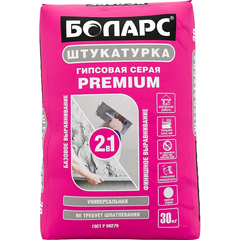 Гипсовая штукатурка БОЛАРС PREMIUM серая, 30 кг 00000042633 - это универсальная гипсовая штукатурка для высококачественного базового и финишного выравнивания стен и потолков в помещениях с нормальной влажностью. Благодаря пластичности и эластичности состава, продукт удобен в работе, позволяет наносить слой до 50 мм за 1 проход без использования штукатурной сетки. Создает гладкую поверхность, заглянцовывается до зеркального состояния. Не требует дальнейшего шпатлевания под последующую окраску, оклейку обоями и нанесение финишных декоративных покрытий. За счет паропроницаемости позволяет стенам "дышать", что создает благоприятный микроклимат в помещении. Наносится ручным способом на бетонные, пено- и газобетонные, газосиликатные, кирпичные, каменные кладки, любые оштукатуренные поверхности, ГКЛ, ГВЛ.