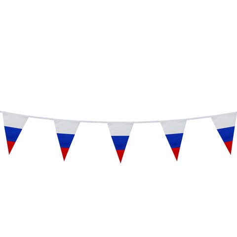 Гирлянда состоит из 10 треугольных флажков на ленте, которые выполнены из полиэфирного шелка, в цветах флага Российской Федерации. Размер флажка - 20х30 см, длина гирлянды - 5 м. Поставляется в пакете с европодвесом.
