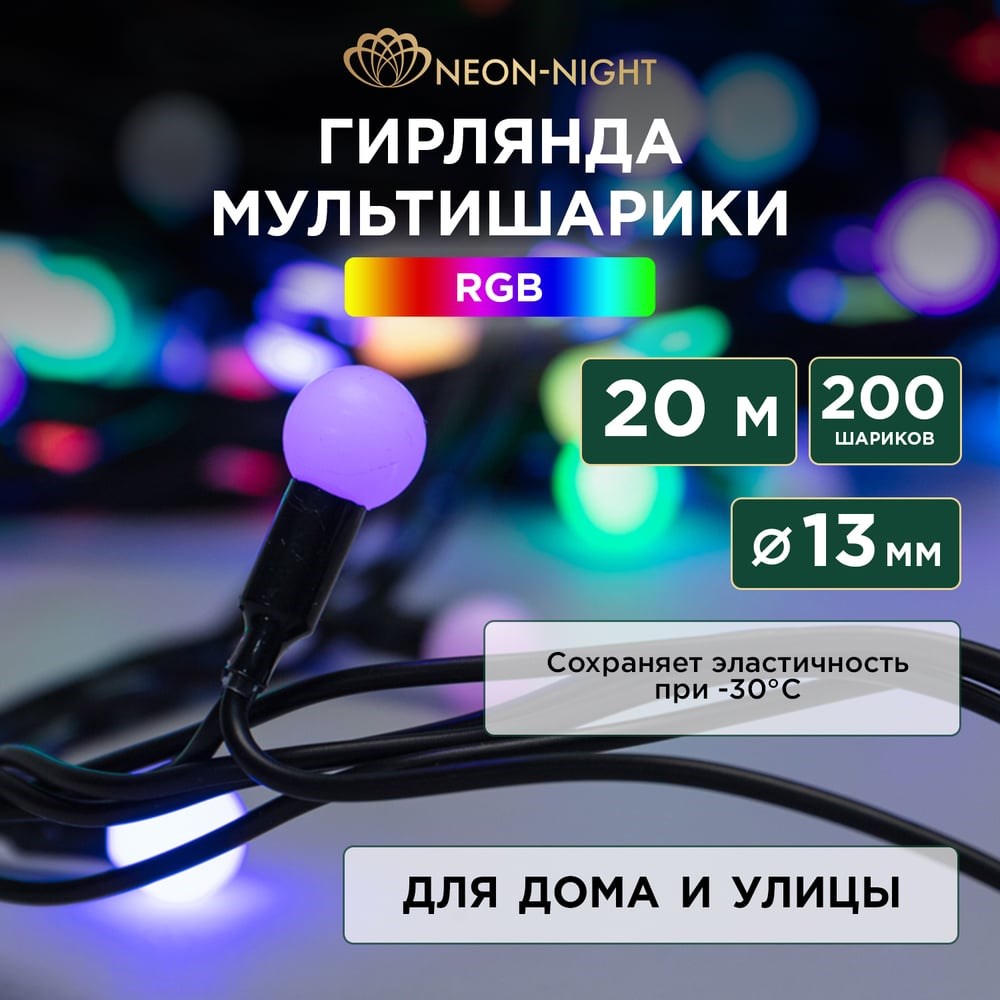 Гирлянда Neon-Night мультишарики d=13 мм 20м 200LED RGB, черный ПВХ