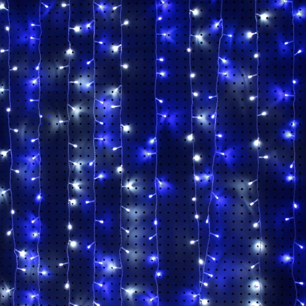 Гирлянда Занавес SHLights 1,5х1,5 метра 368 светодиодов, синий\белый LDCL368-BW-E - эффектное изделие с белыми и синими светодиодами. Конструкция модели представляет собой 16 нитей, последовательно присоединенных в основному проводу длиной 1,5 метра. Каждая нить содержит по 23 LED-лампы, всего - 368 светодиодов. Изделие предназначено для декорирования объектов внутри помещений, может удлиняться до 12 метров путем присоединения дополнительных модулей, максимальное количество соединений - 8 гирлянд. Световая декорация "Занавес" работает от сети 220В.