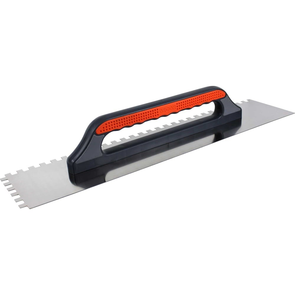 Гладилка для нанесения и распределения клея для плитки, кафеля и керамогранита.Удобная прорезиненная ручка облегчает работу с раствором.