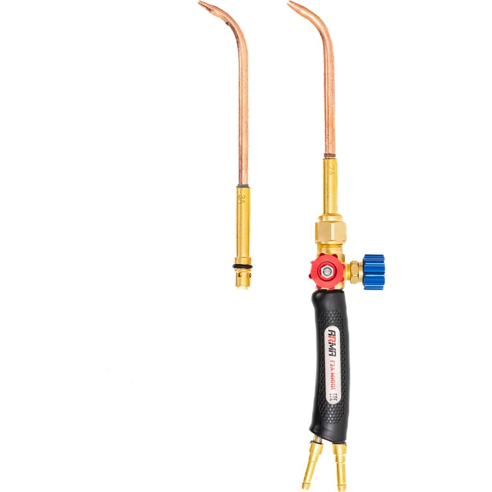 Инжекторная горелка для сварки металлов толщиной до 4 мм. Укомплектована латунными сварочными наконечниками с медными мундштуками № 2А (1,0–2,0 мм)) и 3А (2,0–4,0 мм) Горелка ацетиленовая Г2А МИНИ (№ 2А, 3А) предназначена для сварки, пайки высокотемпературными припоями, нагрева, плавления и прочих видов газопламенной обработки металлов. На горелках установлена ручка из высокотемпературного штампованного пластика, выдерживающая температуру до 200°С, благодаря чему можно работать в тонких рукавицах. Горелка укомплектована медными цельнотянутыми наконечниками, которые позволяют выполнять работы в ограниченном пространстве и в труднодоступных местах. Точная регулировка мощности пламени в пределах одного наконечника производится вентилями, ступенчатое изменение — сменой наконечников. Особенности горелки ацетиленовой Г2А МИНИ (№ 2А, 3А):Горелка обладает компактными размерами и облегченной конструкцией.Материал наконечников - медная цельнотянутая трубка. Это обеспечивает большую продолжительность работы без перегрева за счет улучшенного теплоотвода.Конструктивная особенность коротких загнутых «носиков» в каждом наконечнике позволяет производить сварочные работы в очень стесненных условиях, производить угловые швы.Горелка укомплектована ниппелями, что позволяет использовать резинотканевые рукава с внутренним диаметром 6 мм без дополнительных переходников, и накидными гайками M12х1,25 для подачи кислорода и M12х1,25LH для подачи ацетилена.