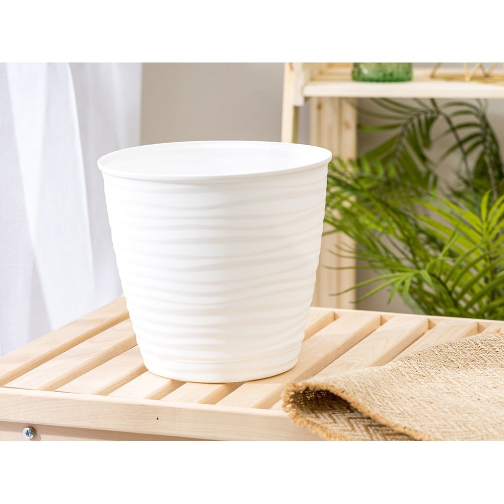 Горшок объёмом 5,4 литра идеален для больших растений. Горшок включает в себя две части: корпус и поддон, который находится внутри горшка и не выступает за его края.В горшке имеются несколько отверстий для дренажа для обеспечения хорошей вентиляции корням растения. Каждый поддон оснащен специальной выемкой для стока лишней воды, что рекомендуется для ухода за любыми видами цветов.Горшок с матовым покрытием и рельефными волнистыми стенками смотрится стильно и гармонично.Это изделие напоминает нам о песчаных барханах и нежном шуме моря. Изготовлен из долговечного и перерабатываемого полипропилена.