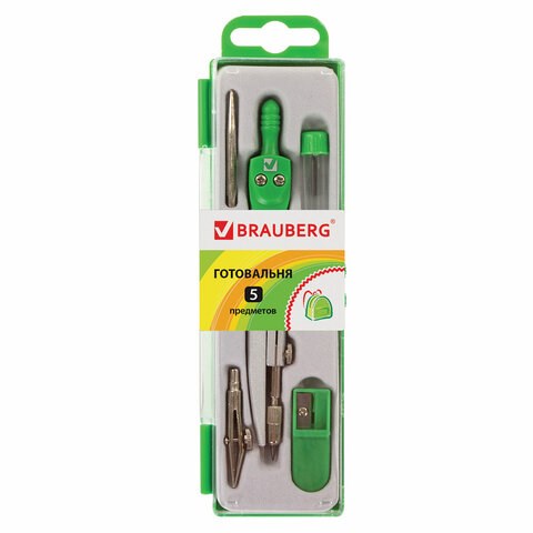 Готовальня BRAUBERG "Klasse", 5 предметов: циркуль 125 мм, 2 вставки, грифель, точилка, пенал с подвесом, 210336