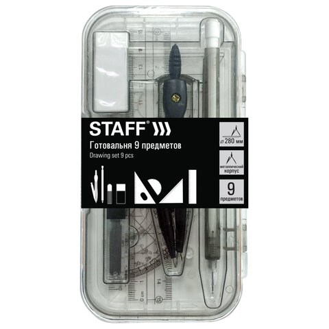 Готовальня STAFF "College" 9 предметов: циркуль 120 мм, чертежные принадлежности, механический карандаш, пластиковый пенал, 210863