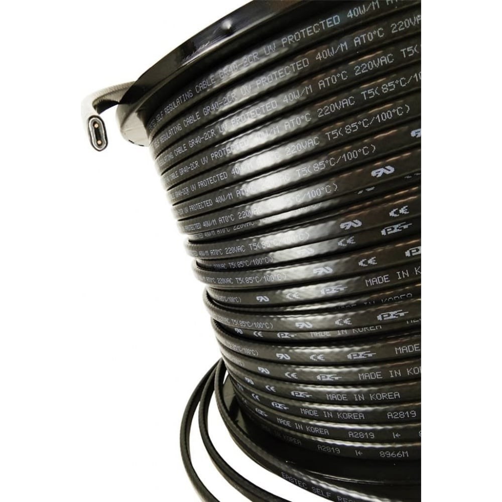 Греющий кабель EASTEC GR 40-2 CR производится в Южной Корее. Температурный класс кабеля Т5, разогрев кабеля до 85 град.С, максимальная температура внешнего воздействия на оболочку кабеля до 100 град.С. Размер кабеля 12,8х6,5мм.Кабель саморегулирующийся, с экранирующей оплеткой из медной луженой проволоки, которая обеспечивает электробезопасность (заземление) и придает дополнительную механическую прочность кабелю. Водонепроницаемая оболочка позволяет использовать кабель в контакте с водой. Это максимально эффективный кабель в линейке EASTEC для обогрева кровли и водостоков. Ультра УФ-защита оболочки позволяет использовать его длительное время под прямым воздействием солнечных лучей. Мощность кабеля 40 Вт/м позволяет создать эффективную систему обогрева кровли, желобов и водосточных труб, защитить здание от наледи и образования сосулек.Корейский греющий кабель EASTEC имеет низкий пусковой ток, всего в 3 раза превышающий номинальный, что важно при расчете нагрузки, и длительный срок службы матрицы без потери мощности - 10 лет.Для соединения греющего кабеля с электрическим проводом рекомендуем использовать клеевые термомуфты и гильзы, например, EASTEC Комплект для заделки кабеля (код товара 28271000).Включение обогрева рекомендуется при приближении заморозков и отключение при устойчивых плюсовых температурах.Для продления срока службы кабеля и регулировки работы системы антиобледенения рекомендуем использовать терморегулятор, например, EASTEC Е-32 (код товара 26184671).