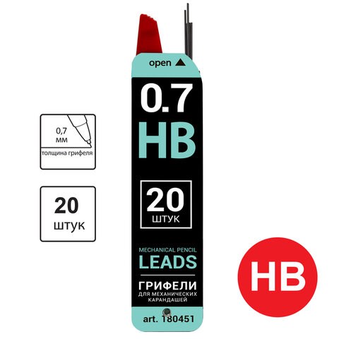 Изготовлены из высококачественных полимерных материалов, обеспечивающих мягкое письмо. Устойчивы к излому. Обладают средней степенью твердости – HB. Длина грифеля составляет 60 мм, а его диаметр - 0,7 мм. 20 штук в упаковке. Поставляются в пластиковом пенале.