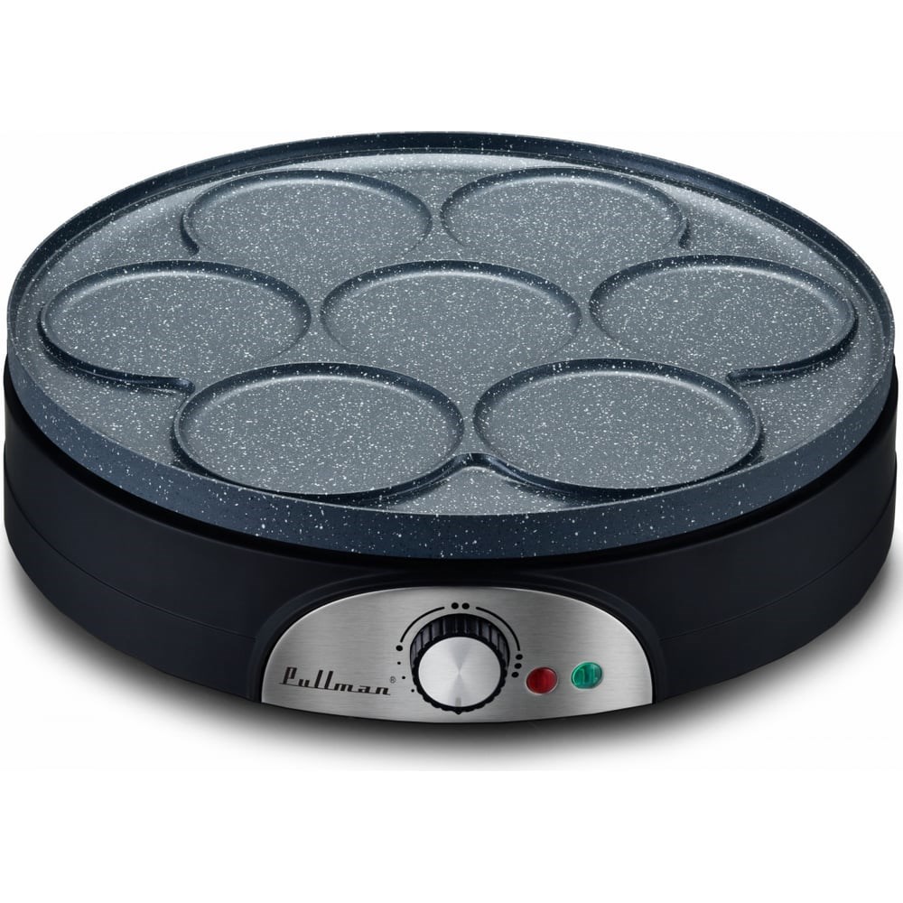 Блинница Pullman PL-1161, со сменными панелями. 2 прибора в 1: для больших блинов диаметром 37 см или 7 оладий диаметром 11 см. Можно приготовить яичницу на 7 человек одновременно, поджарить бекон, подогреть пиццу, выпекать лепешки, овощные и печеночные оладьи и многое другое! Мощность 1500 Вт. Высококачественное керамическое антипригарное покрытие панелей. В комплекте: пластиковые шпатель, лопатка, кисть с силиконовыми ворсинками в подарок! Индикатор нагрева и сети. Регулировка температуры. Сменные панели – легко мыть! Размер прибора – 39х39х10 см. Электропровод 75 см. Вес прибора – 2.6 кг.