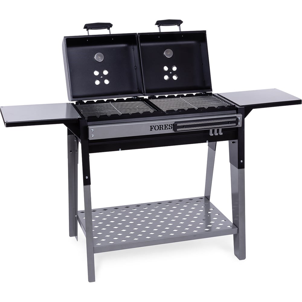 FORESTER ГРИЛЬ-МАНГАЛ с двумя крышками и полкой-насадкой для казана, предназначен для приготовления продуктов на углях. Гриль-мангал покрыт жаростойкой эмалью, выдерживающей температуру 800° С. Насадка с отверстием для размещения посуды (казан, садж, сковорода) трансформируется в удобную полку с накладкой размером 36x28,5 см для размещения продуктов. Регулятор поддува (заслонка) на крышке гриля и термометр позволяет управлять жаром в гриль-отсеке (половина жаровни под крышкой). Можно готовить два разных блюда под крышками одновременно. При снятой перегородке можно использовать как большой мангал на 12 шампуров. Имеет разборную конструкцию, удобную для транспортировки и хранения. Технические характеристики: Габаритные размеры гриля в сложенном виде: 81х49х29 см; в рабочем состоянии: 147х88х51,5 см. Размер решетки-гриль: 36,5x29,5x0,8 см. Диаметр отверстия полки-насадки для размещения посуды: 25 см. Масса нетто: 26,5 кг