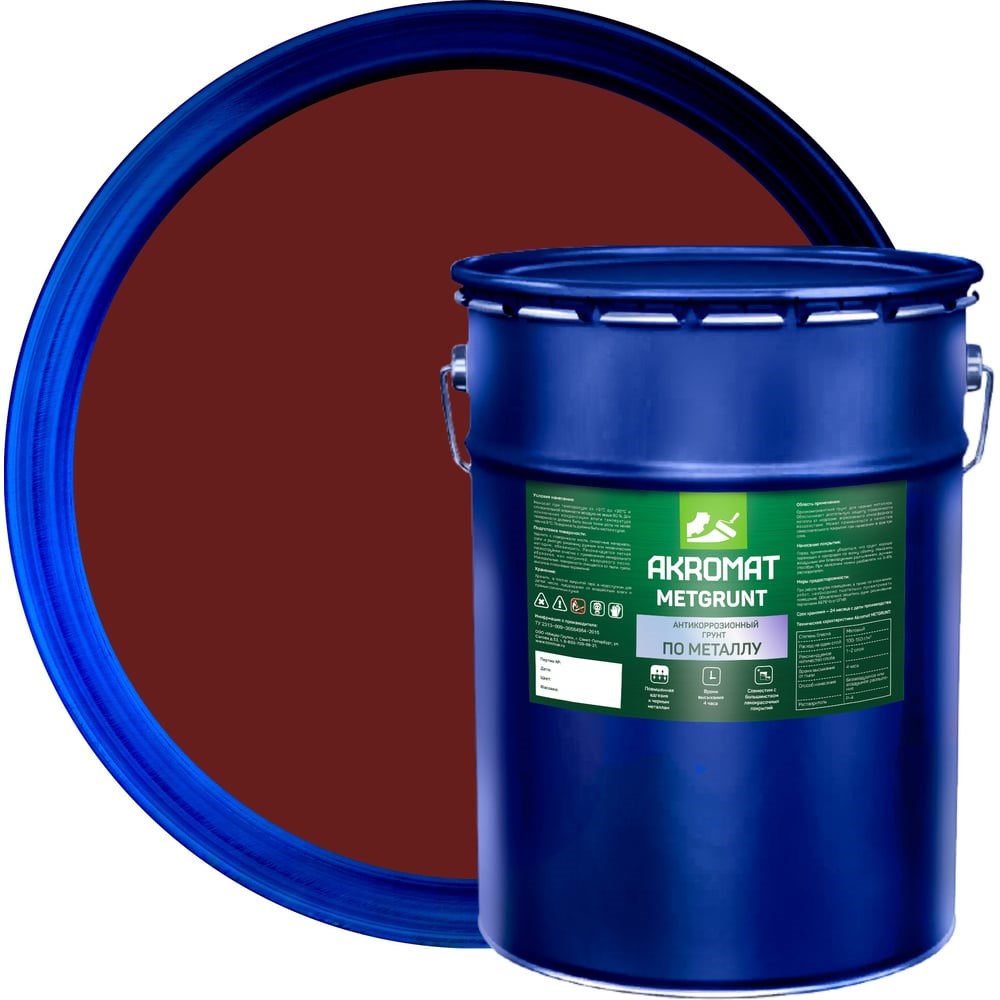 Корабельная грунт-эмаль по металлу Акромат METGRUNT 25 кг, красно-коричневый УТ000009343 используют в нефтегазовой отрасли, судо- и машиностроении для обработки различных конструкций из черных металлов. Продукт можно наносить на ржавчину или старое лакокрасочные покрытие. Однокомпонентный состав обеспечивает надежную защиту поверхности от коррозии и неблагоприятного атмосферного воздействия (дождь, снег, ультрафиолет).