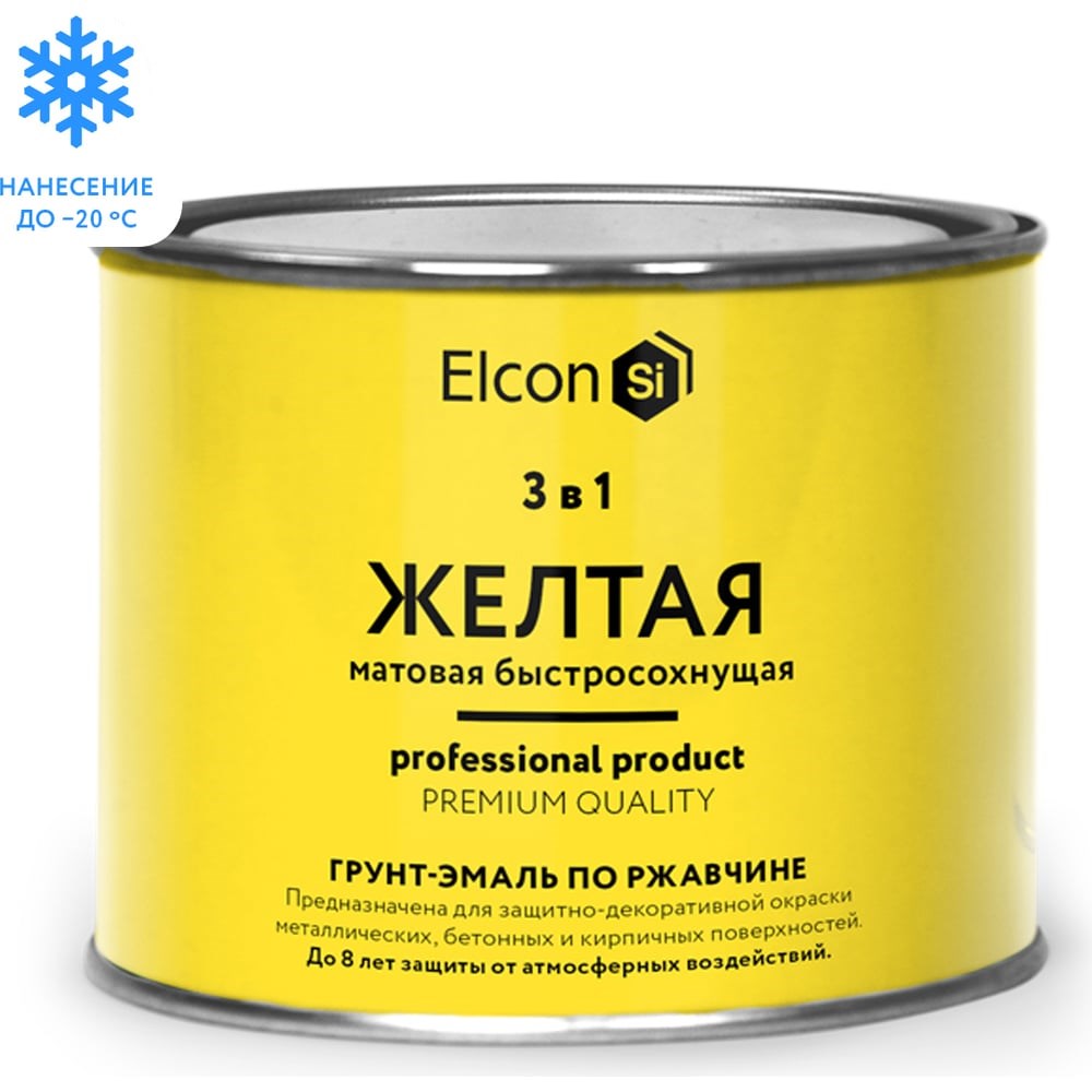 Быстросохнущая краска по металлу Elcon (3 в 1 по ржавчине; матовая; желтая; 0,4 кг) 00-00462641Грунт-эмаль 3 в 1 по ржавчине Elcon — это быстросохнущая краска по металлу, совмещающая функции преобразователя ржавчины, грунта и эмали. Грунт-эмаль по ржавчине Elcon 3 в 1 как на чистые, так и на пораженные коррозией поверхности после удаления рыхлого слоя ржавчины. Состав применяется как краска для металла для наружных работ и внутренних работ. Грунт-эмаль создает долговечное коррозионностойкое покрытие со сроком службы до 8 лет.Свойства:• 3 в 1: Совмещает свойства преобразователя ржавчины, грунта и финишного покрытия.• Нанесение на ржавчину: Предназначена для использования в качестве краски по ржавчине и краски по металлу.• Быстрая сушка: Время высыхания «на отлип» — 1 час при +20°C.• Низкотемпературное нанесение: Грунт-эмаль Elcon 3 в 1 можно наносить при температурах до -20°C.•Атмосферостойкость: Формирует покрытие, устойчивое к атмосферным воздействиям.• Цвет: Грунт-эмаль по ржавчине соответствует оттенкам RALK5Области применения:Грунт-эмаль по металлуElcon 3 в 1 применяется для антикоррозионной защиты любых металлических поверхностей Строительные металлоконструкции: балки, каркасы, элементы кровли Уличные объекты: ограждения, ворота, двери, уличная мебель Легковесные металлоизделия: декоративные элементы, щиты, корпуса