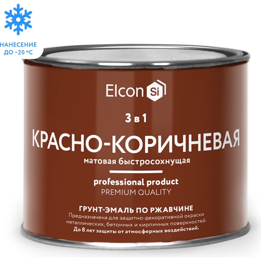 Быстросохнущая грунт-эмаль по металлу Elcon (3 в 1 по ржавчине; матовая; красно-коричневая; 0,4 кг) 00-00462645Грунт-эмаль 3 в 1 по ржавчине Elcon — это быстросохнущая краска по металлу, совмещающая функции преобразователя ржавчины, грунта и эмали. Грунт-эмаль по ржавчине Elcon 3 в 1 как на чистые, так и на пораженные коррозией поверхности после удаления рыхлого слоя ржавчины. Состав применяется как краска для металла для наружных работ и внутренних работ. Грунт-эмаль создает долговечное коррозионностойкое покрытие со сроком службы до 8 лет.Свойства:• 3 в 1: Совмещает свойства преобразователя ржавчины, грунта и финишного покрытия.• Нанесение на ржавчину: Предназначена для использования в качестве краски по ржавчине и краски по металлу.• Быстрая сушка: Время высыхания «на отлип» — 1 час при +20°C.• Низкотемпературное нанесение: Грунт-эмаль Elcon 3 в 1 можно наносить при температурах до -20°C.•Атмосферостойкость: Формирует покрытие, устойчивое к атмосферным воздействиям.• Цвет: Грунт-эмаль по ржавчине соответствует оттенкам RALK5Области применения:Грунт-эмаль по металлуElcon 3 в 1 применяется для антикоррозионной защиты любых металлических поверхностей Строительные металлоконструкции: балки, каркасы, элементы кровли Уличные объекты: ограждения, ворота, двери, уличная мебель Легковесные металлоизделия: декоративные элементы, щиты, корпуса