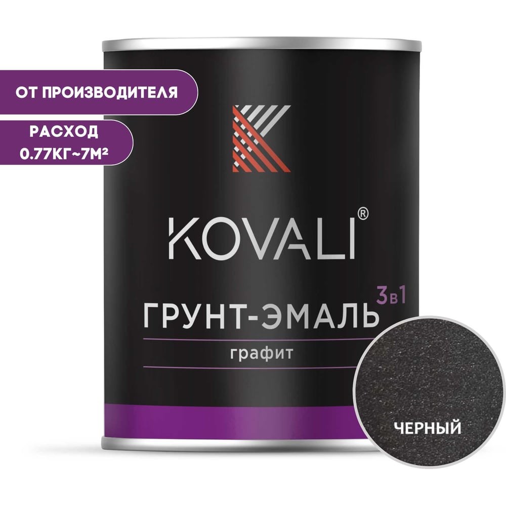 Грунт-эмаль «KOVALI» 3 в 1 с эффектом графита предназначена для защитно-декоративной отделки элементов конструкций строительного и бытового назначения, деталей, приборов и механизмов, изделий художественной ковки, металлической мебели (шкафы, сейфы, стеллажи), а также любых других металлических изделий, требующих хороших декоративных свойств и длительного срока службы, эксплуатируемых в условиях открытой атмосферы, так и внутри помещений. Благодаря эффекту графита Грунт-Эмаль Kovali превосходно скрывает дефекты поверхностей окрашиваемых изделий. Характеристики: Выдерживает перепад температур от — 60°C до + 150°C Время сушки на отлип при температуре (20±2)°С – 30 мин. Время окончательной сушки при температуре (20±2)°С – 24 часа Окраска производится при температуре окружающей среды от +10°С до +25°С и относительной влажности воздуха 80% Защищает от коррозии, влаги, паро- и воздухопроницаема, не выгорает, устойчива к УФ Метод нанесения: кисть, валик, краскопульт Расход на покрытие в два-три слоя — 80-120 г/м2