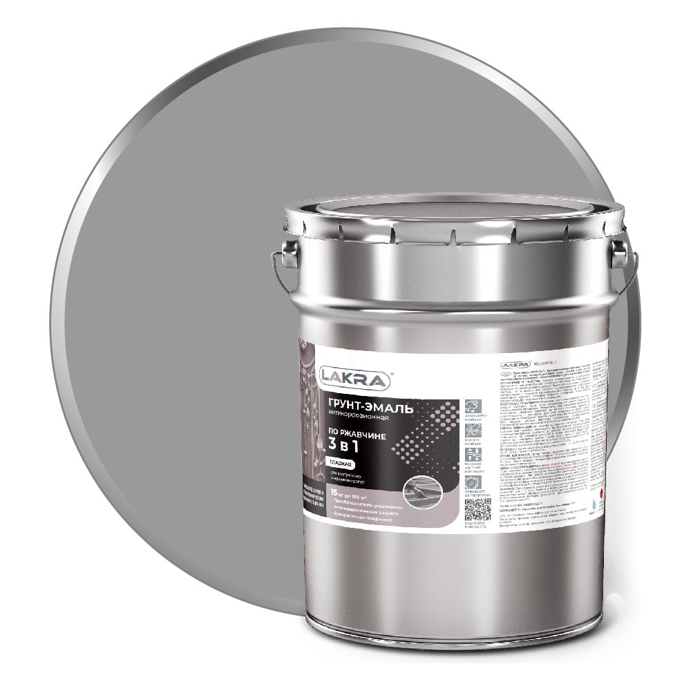 Грунт-эмаль 3 в 1 Лакра серый, 15 кг Лк-00002808 предназначен для окрашивания и защиты от ржавчины поверхностей из металла. Средство наносится в один-два слоя. Перед использованием грунта-эмали следует очистить поверхность от загрязнений. Подойдет для окрашивания как не поврежденного металла, так и с наличием ржавчины толщиной до 0.1 мм.