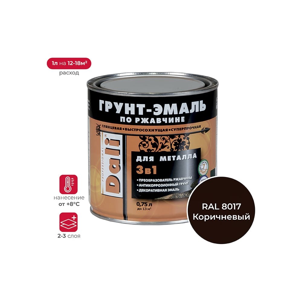 Предназначена для защитно-декоративной обработки различных металлических поверхностей. Применяется внутри и снаружи помещений по ЛЮБЫМ металлическим поверхностям, новым и ранее окрашенным.Допускается нанесение на деревянные поверхности влажностью не выше 20%, эксплуатируемые внутри помещений. Условия проведения работ: t° окружающего воздуха и поверхности от +8° до +30°С, относительная влажность воздуха не более 80%. Подготовка поверхности: ранее окрашенные поверхности рекомендуется предварительно проверить на совместимость: нанести грунт-эмаль на небольшой участок и выждать 60±5 мин. В случае отсутствия дефектов, поверхность очистить только от отслаивающихся слоев предыдущего покрытия. В противном случае полностью удалить старое покрытие. Не наносить на покрытия на основе НЦ и ХВ. В случае наличия ржавчины, очистить поверхность от рыхлого слоя металлической щеткой, протереть от пыли, грязи, обезжирить поверхность растворителем 646, бензином, уайт-спиритом, сольвентом или ацетоном и насухо протереть чистой тканью. Наносить в 2-3 слоя. Разбавление: допускается, но не более 10% от общей массы. Разбавитель: сольвент, ксилол, Р646/647. Расход: в 1 слой 1л на 12-18м². Высыхание: на отлип до 3 ч., межслойная сушка от 5 мин. до 3 ч., окончательный набор прочности до 7 суток. Степень глянца: глянцевый (не менее 75%). Очистка инструмента: уайт-спирит, сольвент, ксилол, Р 646/647. Хранение и транспортировка: при t° от -40° до +40°С не теряет свойств при замораживании. 8017 Коричневый