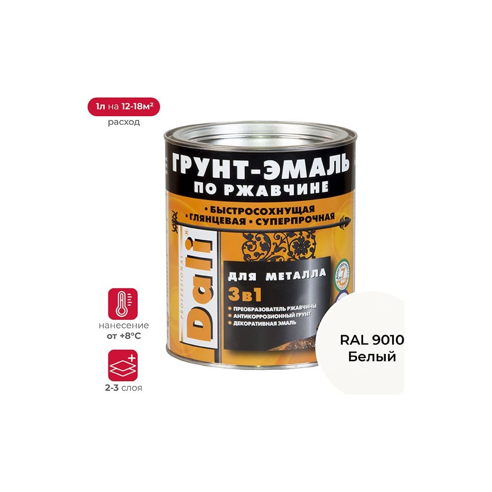 Предназначена для защитно-декоративной обработки различных металлических поверхностей. Применяется внутри и снаружи помещений по ЛЮБЫМ металлическим поверхностям, новым и ранее окрашенным.Допускается нанесение на деревянные поверхности влажностью не выше 20%, эксплуатируемые внутри помещений. Условия проведения работ: t° окружающего воздуха и поверхности от +8° до +30°С, относительная влажность воздуха не более 80%. Подготовка поверхности: ранее окрашенные поверхности рекомендуется предварительно проверить на совместимость: нанести грунт-эмаль на небольшой участок и выждать 60±5 мин. В случае отсутствия дефектов, поверхность очистить только от отслаивающихся слоев предыдущего покрытия. В противном случае полностью удалить старое покрытие. Не наносить на покрытия на основе НЦ и ХВ. В случае наличия ржавчины, очистить поверхность от рыхлого слоя металлической щеткой, протереть от пыли, грязи, обезжирить поверхность растворителем 646, бензином, уайт-спиритом, сольвентом или ацетоном и насухо протереть чистой тканью. Наносить в 2-3 слоя. Разбавление: допускается, но не более 10% от общей массы. Разбавитель: сольвент, ксилол, Р646/647. Расход: в 1 слой 1л на 12-18м². Высыхание: на отлип до 3 ч., межслойная сушка от 5 мин. до 3 ч., окончательный набор прочности до 7 суток. Степень глянца: глянцевый (не менее 75%). Очистка инструмента: уайт-спирит, сольвент, ксилол, Р 646/647. Хранение и транспортировка: при t° от -40° до +40°С не теряет свойств при замораживании. RAL 9010 Белый