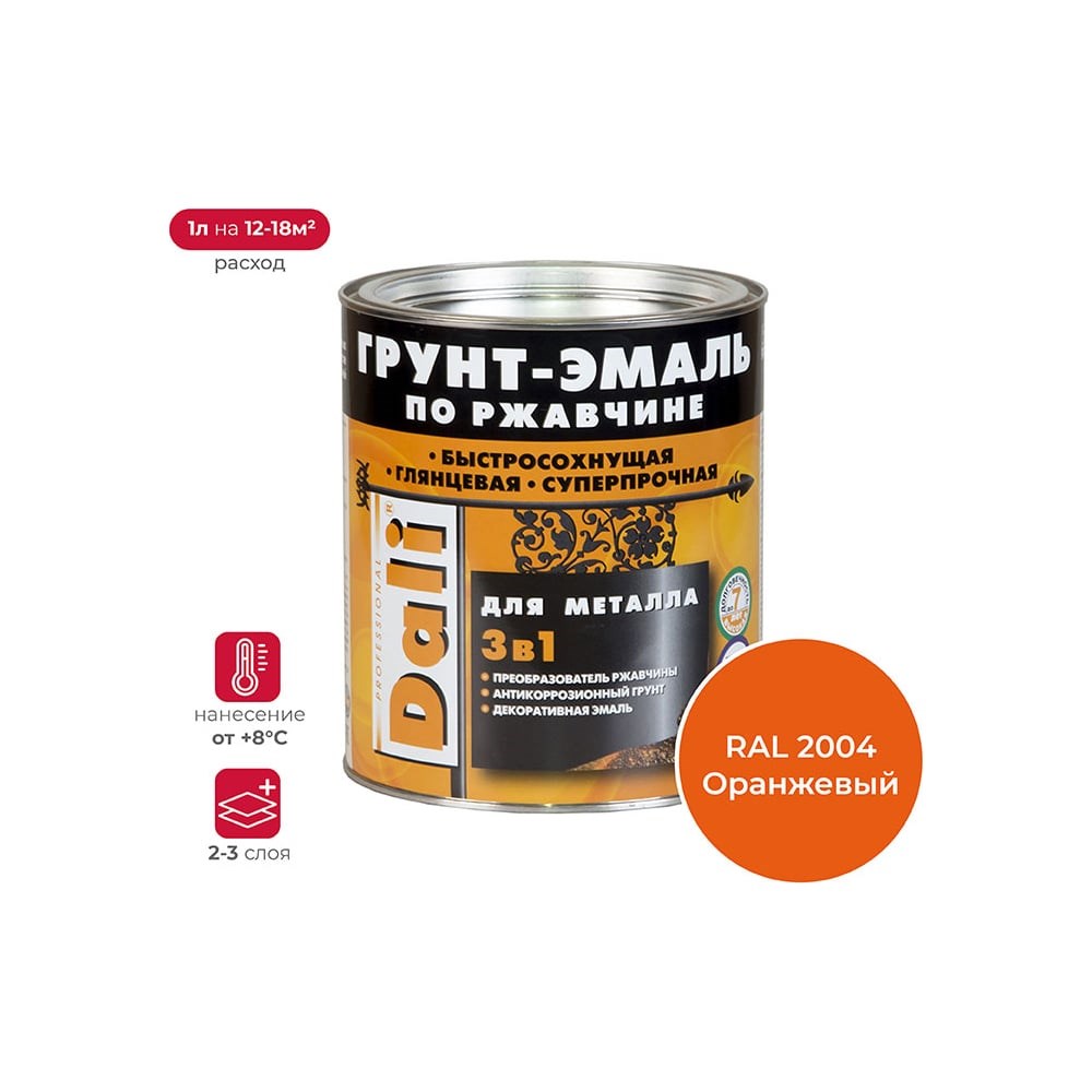 Предназначена для защитно-декоративной обработки различных металлических поверхностей, в том числе пораженных точечной или сплошной коррозией c толщиной ржавчины до 100 мкм. Применяется внутри и снаружи помещений по любым металлическим поверхностям, новым и ранее окрашенным: - Стальным и чугунным (решетки, ограды, гаражи, ворота и пр.); - Цветным металлам (цинк, медь, алюминий); - Поверхностям из оцинкованного металла (профнастил) и нержавеющей стали; - Допускается нанесение на деревянные поверхности влажностью не выше 20%, эксплуатируемые внутри помещений. Состав: модифицированная алкидная смола, восстановитель металла, ингибитор коррозии, пигменты, наполнитель, антикоррозионные и функциональные добавки, растворитель; Основа: алкидная; Метод нанесения: кисть, валик, распыление; Разбавление: допускается, но не более 10% от общей массы состава; Разбавитель: универсальный растворитель Dali™, сольвент, ксилол, Р646/647; Температура применения: +8 до +30 °С; Количество слоев: 2 - 3; Расход:12 - 18 л/м²; Время высыхания: на отлип до 3 часов, межслойная сушка от 5 минут до 3 часов, окончательный набор прочности покрытия до 7 суток; Степень глянца: глянцевый; Колеровка: нет; Плотность: 1,2 - 1,3 г/см³; Термостойкость покрытия: до +80 °С; Объем: 2 л; Цвет: оранжевый. RAL 2004 Оранжевый