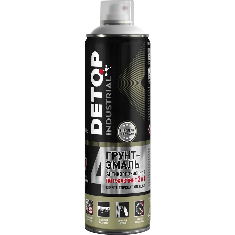 Грунт-эмаль DETOP по ржавчине 3 в 1, белый, RAL 9001, аэрозоль 650 мл DTI-A07711 выполняет функцию преобразователя ржавчины, антикоррозионного грунта и декоративной эмали. Применяется для покраски чугунных и стальных поверхностей с различной степенью коррозии: от следов коррозии до полностью покрытых ржавчиной, плотно сцепленной с металлом, толщиной до 70 мкм. Предназначена для защиты металлических конструкций промышленного назначения, очистка которых затруднена. Используется для окраски поверхностей, подвергающихся атмосферному воздействию, в том числе промышленной атмосферы, содержащей агрессивные газы и пары, соли и другие химические реагенты, имеющие температуру не выше 60 градусов. Внимание! Фото может отличаться от товара, при выборе ориентируйтесь на технические характеристики.