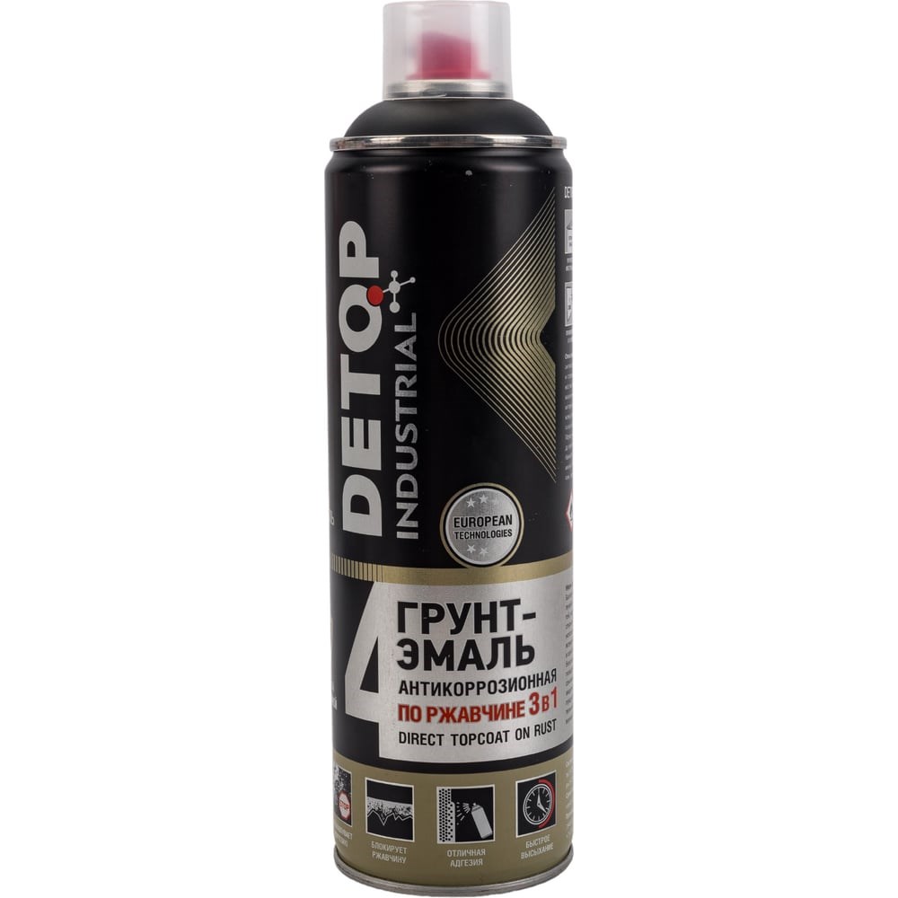 Грунт-эмаль DETOP по ржавчине 3 в 1, черный, RAL 9004, аэрозоль 650 мл DTI-A07721 выполняет функцию преобразователя ржавчины, антикоррозионного грунта и декоративной эмали. Применяется для покраски чугунных и стальных поверхностей с различной степенью коррозии: от следов коррозии до полностью покрытых ржавчиной, плотно сцепленной с металлом, толщиной до 70 мкм. Предназначена для защиты металлических конструкций промышленного назначения, очистка которых затруднена. Используется для окраски поверхностей, подвергающихся атмосферному воздействию, в том числе промышленной атмосферы, содержащей агрессивные газы и пары, соли и другие химические реагенты, имеющие температуру не выше 60 градусов. Внимание! Фото может отличаться от товара, при выборе ориентируйтесь на технические характеристики.