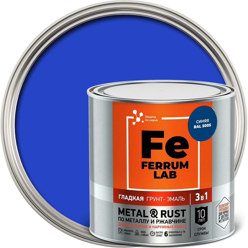 Грунт-эмаль FERRUM LAB по ржавчине 3 в 1 гладкая синяя RAL 5005 глянцевая, банка 0,75 л 213339 с антикоррозийными пигментами применяется для создания износостойкого защитно-декоративного покрытия на чёрных и цветных металлах. Материал обладает повышенной стойкостью к механическим нагрузкам, действию солей, масел, бензинов, благодаря чему имеет широкий спектр применения в промышленности и в быту. Грунт-эмаль не требует предварительного грунтования, может наноситься на чистый и ржавый металл, в том числе с продуктами точечной, сплошной коррозии, с остатками старого покрытия, плотно сцепленных с основанием. Подходит для оцинкованного металла и алюминия после предварительной подготовки основания.