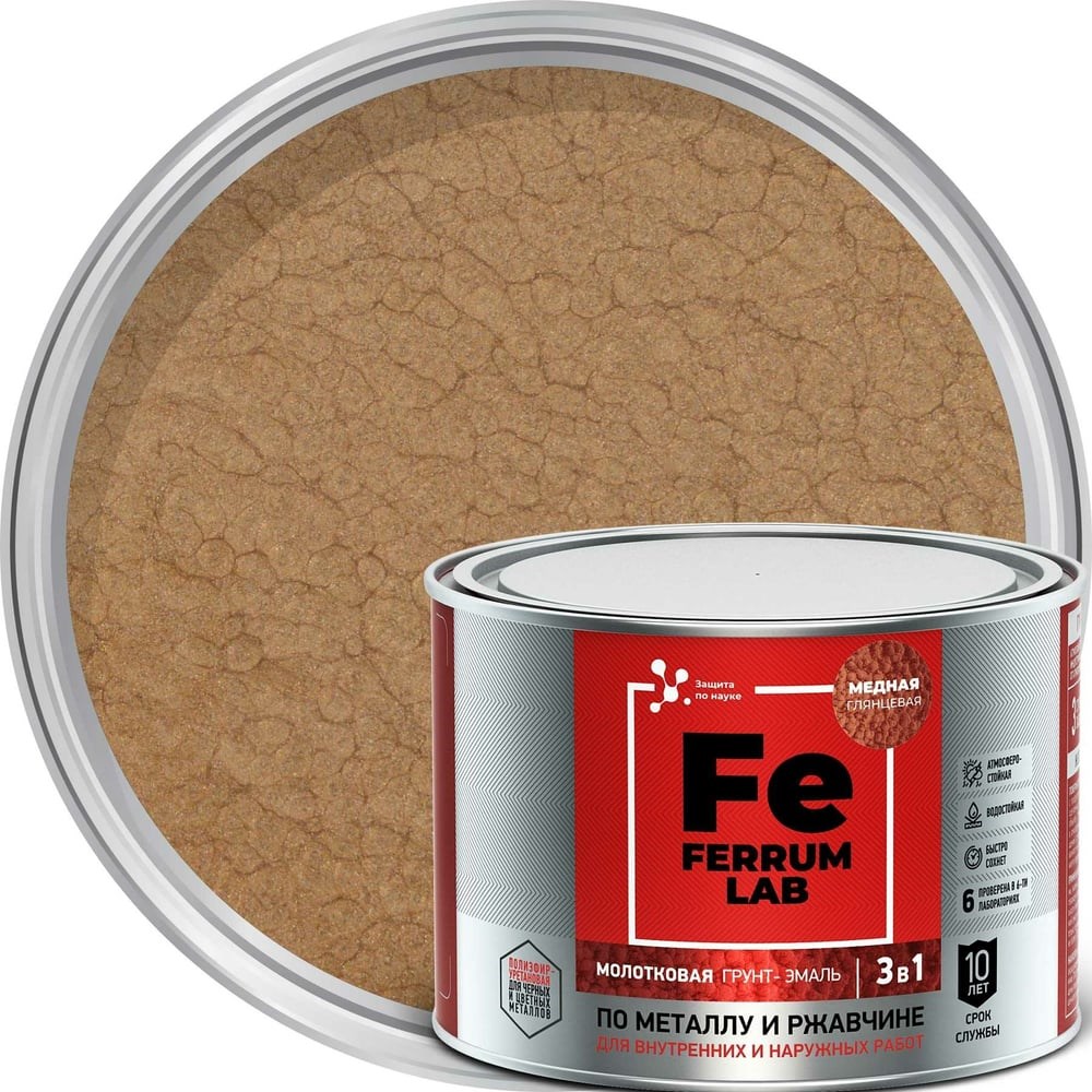 Грунт-эмаль FERRUM LAB по ржавчине 3 в 1 молотковая медная, банка 0,4 л 213549 с декоративный эффектом ручной чеканки применяется для создания износостойкого защитно-декоративного покрытия на чёрных и цветных металлах. Материал обладает повышенной стойкостью к механическим нагрузкам, действию солей, масел, бензинов, благодаря чему имеет широкий спектр применения в промышленности и в быту. Грунт-эмаль не требует предварительного грунтования, может наноситься на чистый и ржавый металл, в том числе с продуктами точечной, сплошной коррозии, с остатками старого покрытия, плотно сцепленных с основанием. Подходит для оцинкованного металла и алюминия после предварительной подготовки основания. Допускается окрашивание деревянных поверхностей.
