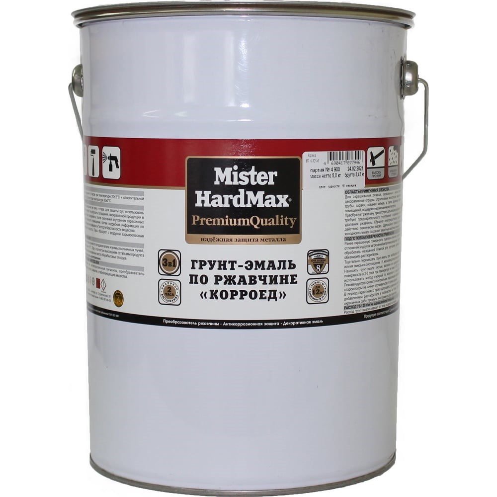 Грунт-эмаль по ржавчине HardMax Корроед черная, барабан 5 кг, 1 шт. 4690417077939 служит для одновременного преобразования ржавчины, антикоррозионного грунтования, финишной окраски чистых и прокорродировавших металлических поверхностей (с толщиной прочно связанной с металлом ржавчины до 100 мкм). Используют для обработки строительных конструкций, промышленного оборудования, складских помещений, ангаров, гаражей, труб, ворот, дверей, навесов, кованной мебели, декоративных ограждений, решеток. Состав образует прочную, ровную, полуматовую поверхность с высокой атмосферо- и противокоррозионной стойкостью. Покрытие устойчиво к действию технических масел, нефти, дизельного топлива, этилового спирта. Выдерживает кратковременное воздействия пресной и морской воды, слабых кислот и бензина. Применение продукта упрощает подготовку поверхности перед окрашиванием и удешевляет технологию создания антикоррозионного покрытия, т.к. не требует предварительного удаления прочно связанной ржавчины и грунтования. Система покрытия, состоящая из трех слоев грунт-эмали, в условиях умеренно-холодного климата сохраняет защитные свойства в течение 8 лет.