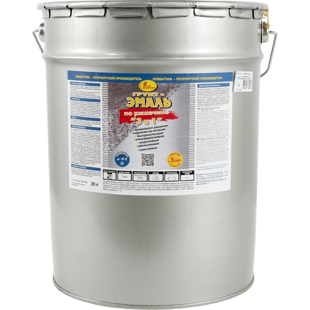 Грунт-эмаль по ржавчине 3в1 НОВБЫТХИМ серая RAL 7040 20 Л 2915 предназначена для окрашивания металлических поверхностей внутри и снаружи помещения.Продукт с незначительным запахом равномерно распределяется по основанию и быстро сохнет, образуя защитный слой от неблагоприятного атмосферного воздействия.Входящие в состав компоненты устойчивы к коррозии, что препятствует естественному окислению металла и увеличивает долговечность конструкции.
