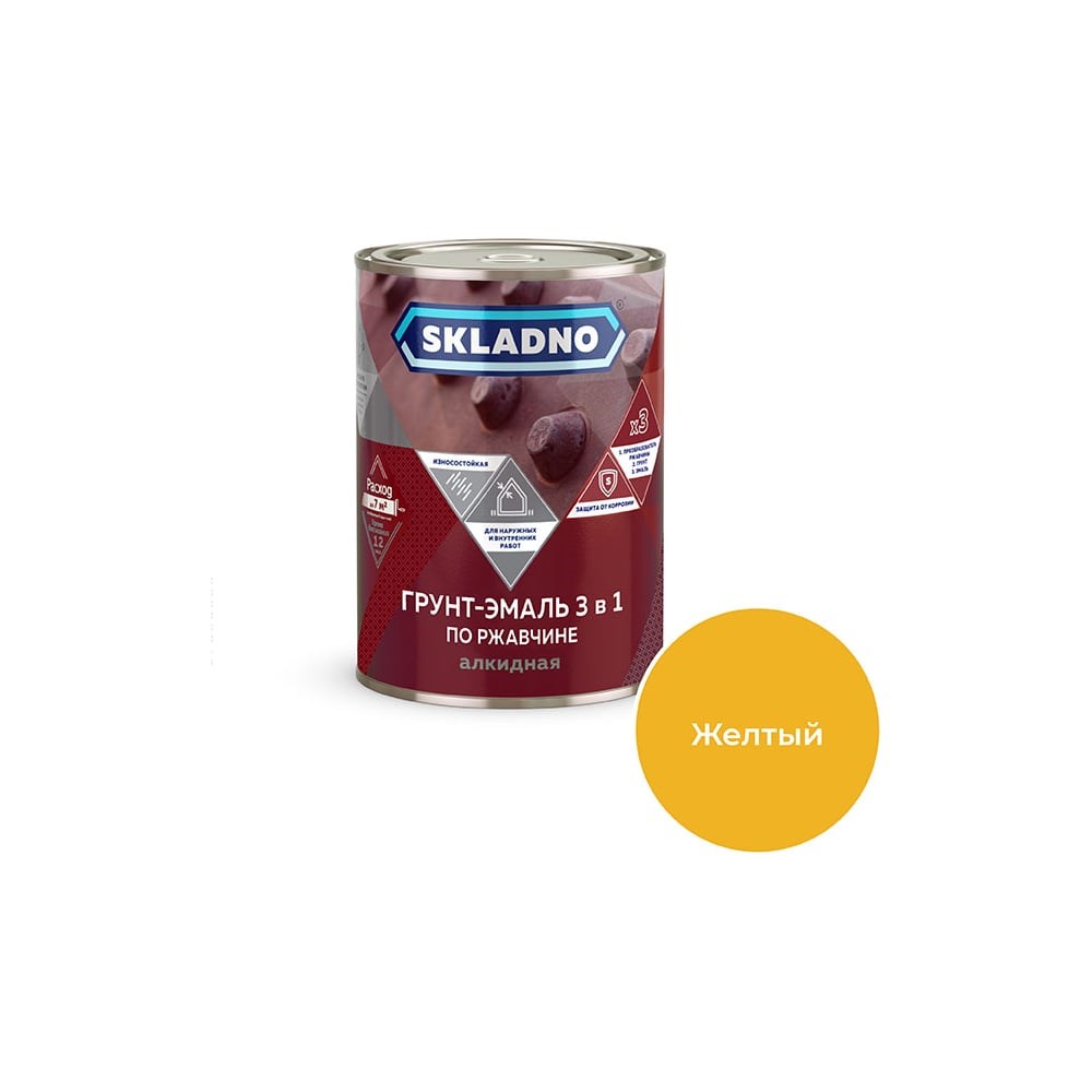 Предназначена для окрашивания чистых и ржавых металлических поверхностей. Состав: модифицированная алкидная смола, антикоррозионные наполнители, пигменты, растворитель, сиккатив, функциональные добавки; Вес: 1,8 кг; Цвет: желтый. Желтый Уникальный продукт сочетающий в себе свойства 3-х компонентов: преобразователя ржавчины, антикоррозионного грунта и декоративной эмали. Преимущества: - Возможно нанесение прямо на ржавую поверхность; - Прекращает развитие ржавчины на металле; - Экономит время - легкая в нанесении.