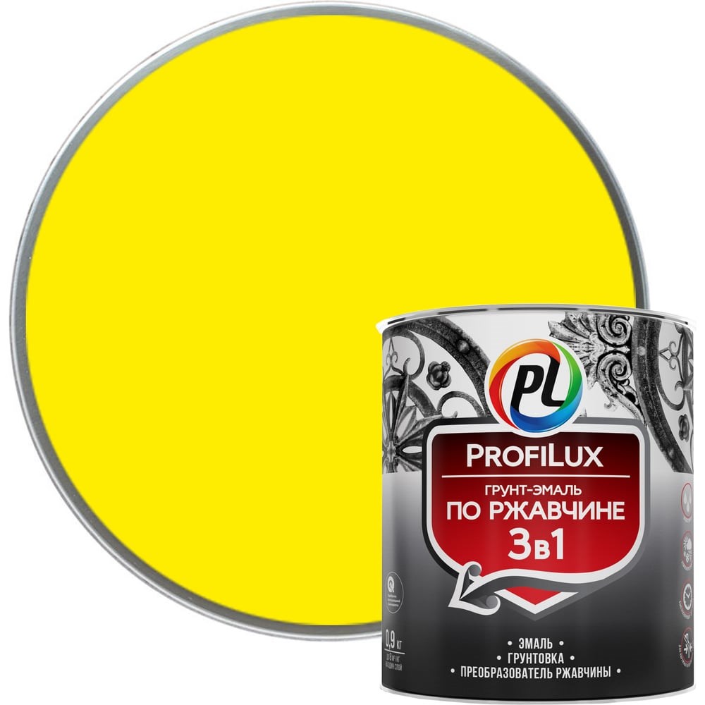 Грунт-эмаль Profilux по ржавчине 3в1 жёлтая 0,9 кг Н0000003576 совмещает в себе функции преобразователя ржавчины, грунтовки и финишного покрытия. Подходит для обработки крупногабаритных конструкций, деталей машин, сельскохозяйственной техники, предметов сложной формы. Состав создает защитно-декоративное покрытие, которое не боится воздействия влаги, атмосферных явлений и моющих веществ. Продукт отличается высокой укрывной способностью и надежным сцеплением с обработанным основанием. Грунт-эмаль полностью готова к использованию.