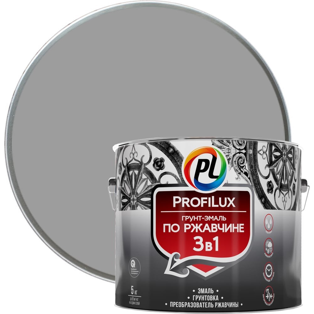 Грунт-эмаль Profilux по ржавчине 3в1 серая 5 кг Н0000004990 совмещает в себе функции преобразователя ржавчины, грунтовки и финишного покрытия. Подходит для обработки крупногабаритных конструкций, деталей машин, сельскохозяйственной техники, предметов сложной формы. Состав создает защитно-декоративное покрытие, которое не боится воздействия влаги, атмосферных явлений и моющих веществ. Продукт отличается высокой укрывной способностью и надежным сцеплением с обработанным основанием. Грунт-эмаль полностью готова к использованию.