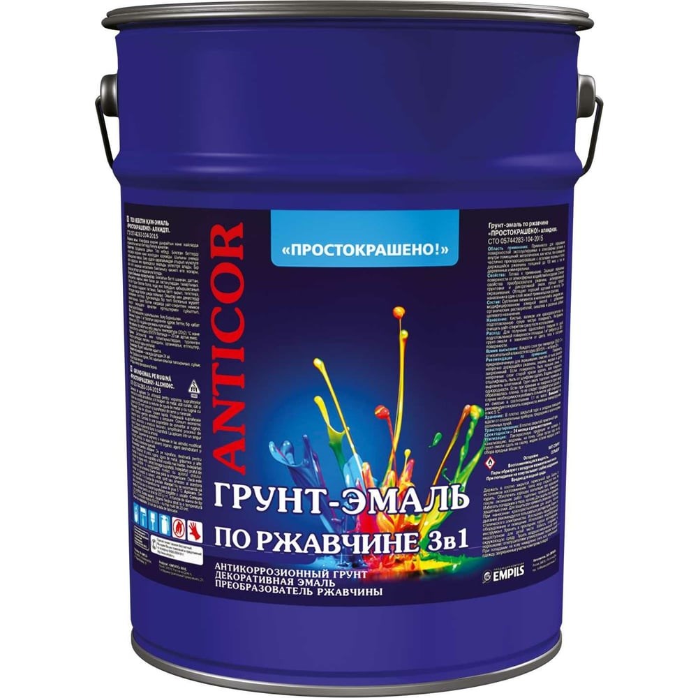 Грунт-эмаль Простокрашено! по ржавчине 3 в 1, белая, 5 кг 70262 применяется для окрашивания поверхностей эксплуатируемых в атмосферных условиях и внутри помещений: металлических, как чистых, так и ржавых или частично прокорродировавших с остатками окалины и плотно держащейся ржавчины до 100 мкм; а также деревянных и минеральных. Продукт сочетает свойства преобразователя ржавчины, антикоррозионной грунтовки и декоративной эмали, упрощая процесс окрашивания. При нанесении в один слой, может использоваться как грунтовка. Внимание! Фото может отличаться от товара, при выборе ориентируйтесь на технические характеристики.