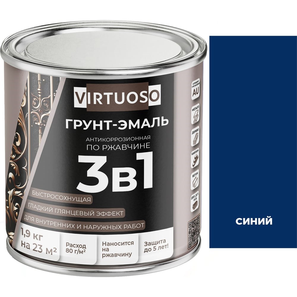 Грунт-эмаль VIRTUOSO PREMIUM 3 в 1 по ржавчине синяя 1,9кг 11592569 создает защитно-декоративное покрытие на поверхностях из металла. Состав подходит для оснований, которые испытывают на себе негативное воздействие влаги и различных атмосферных явлений. Обработанная поверхность получает обновленный внешний вид, а также приобретает высокую устойчивость к износу, коррозии и влиянию чистящих веществ.