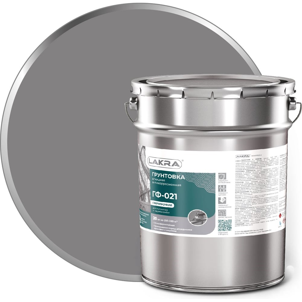 Грунт Лакра ГФ-021 серый, 20 кг 90000681504 предназначен для обработки металлических и деревянных поверхностей перед нанесением лакокрасочных покрытий. Подходит для проведения внутренних и наружных работ. Средство наносится с помощью валика, кисти или распылителя в один-два слоя. Перед использованием грунтовки следует очистить поверхность от загрязнений. Дополнительные характеристики: Время высыхания при температуре +20°С и влажности воздуха 70%: 24 ч; Примерный расход: 10-16 м²/кг.