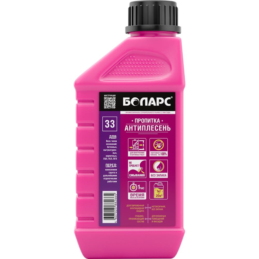 Грунт-пропитка БОЛАРС Антиплесень 33 1 кг 00000042436 - это высокоэффективный грунт-пропитка предназначен для уничтожения и предотвращения роста плесневых грибов и водорослей. Подходит для следующих типов оснований: бетонные, оштукатуренные, кирпичные, пено- и газобетонные поверхности, ГВЛ, ГКЛ, ПГП. Благодаря составу глубоко проникает в поры основания, обеспечивает долговременную фунгицидную защиту. Применяется на фасадах зданий и внутри помещений с любым уровнем влажности. Используется для обработки перед окраской, оклейкой обоями, нанесением строительных растворов, гидроизоляции, плиточных клеев и клеев для напольных покрытий, приклеиванием утеплителя. Расход: 50-100 гр/кв. м.