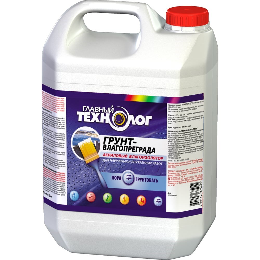 Грунт-влагопреграда НОВБЫТХИМ ГЛАВНЫЙ ТЕХНОЛОГ канистра 5 кг 803 представляет собой водоотталкивающий состав предназначенный для внутренних и наружных работ. Он укрепляет рыхлые поверхности и улучшает адгезию к бетонным, кирпичным, асбесто-цементным, оштукатуренным, гипсокартонным, деревянным и другим пористым поверхностям перед окрашиванием, шпаклеванием, оштукатуриванием, облицовкой керамической плиткой, наклеиванием обоев, окраской фасадов, цоколей, шиферной кровли. Кроме того, грунт-влагопреграда предотвращает образование пыли на обработанной поверхности и защищает ее от плесени и гнили. После нанесения образует бесцветную паропроницаемую эластичную полимерную пленку. Она обладает высокой влаго-, водо- и атмосферостойкостью, устойчива к воздействию ультрафиолета. Грунт-влагопреграда – это экологически безопасный материал, изготовленный с применением нового современного сырья, соответствующий высоким требованиям качества по защитным и технологическим характеристикам. Область применения в строительстве, капитальном и косметическом ремонте: укрепление рыхлых минеральных поверхностей усиление адгезии с наносимым материалом предотвращение образования плесени и грибков во влажных и сырых помещениях перед окраской минеральных, деревянных и других подобных материалов стен, крыш и цоколей зданий