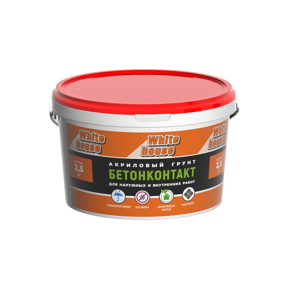 Грунтовка White House БетонКонтакт 2.5 кг 13641 предназначена для обработки поверхностей, эксплуатируемых снаружи и внутри помещений. Образует шероховатое покрытие с высокой адгезией, что позволяет наносить «тяжелые» материалы (например, декоративные толстослойные покрытия, керамическую плитку). Преимущества: Устойчив к интенсивным атмосферным воздействиям Экологически чистый, без запаха Можно наносить на любые старые лакокрасочные покрытия Не препятствует воздухообмену