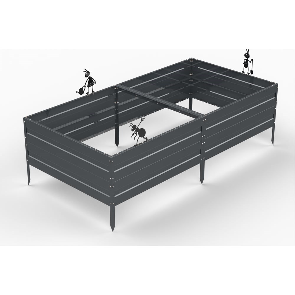 Грядка Metalex серия KitGarden 2x1 х 0.4 м. Серая.Изготовлена из металла толщиной 0,8 мм, что является самой большой толщиной на Российском рынке. После установки грядки не требуют дополнительного ухода. По периметру грядки есть перфорация: размер 7 мм, шаг 50 мм, который позволяет устанавливать декоративные элементы и аксессуары. Усилительные уголки надежно соединяют боковины грядки друг с другом и задают правильную геометрическую форму. В комплект входит набор колышков, который надёжно удерживает грядку в земле. Порошковое покрытие защищает металл от коррозийных процессов и обеспечивает продолжительный срок службы. В набор входит комплект декоративных элементов «Веселые муравьи», они добавляют индивидуальный облик вашему дачному участку. По желанию его можно не устанавливать. Соединение: Болтовое