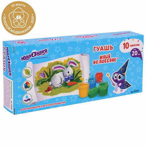 Гуашь ЮНЛАНДИЯ "ЮНЫЙ ВОЛШЕБНИК", 10 цветов по 20 мл, высшее качество, 191332