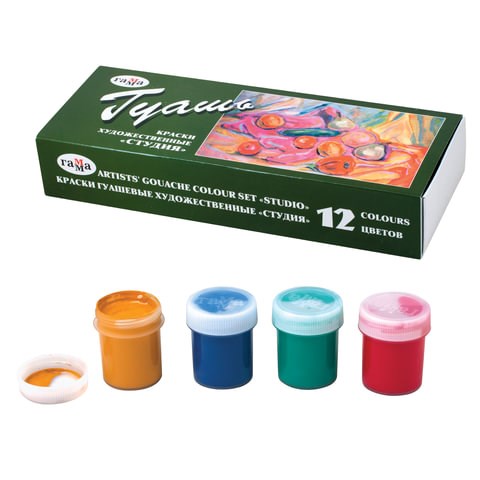Гуашь художественная ГАММА "Студия", 12 цветов по 40 мл, картонная упаковка, 221029