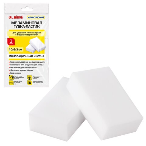 Губка-ластик МЕЛАМИНОВАЯ для удаления пятен, для чистки кухни, уборки, обуви, 10х6х3 см, КОМПЛЕКТ 3 шт., полибэг, LAIMA, 605035