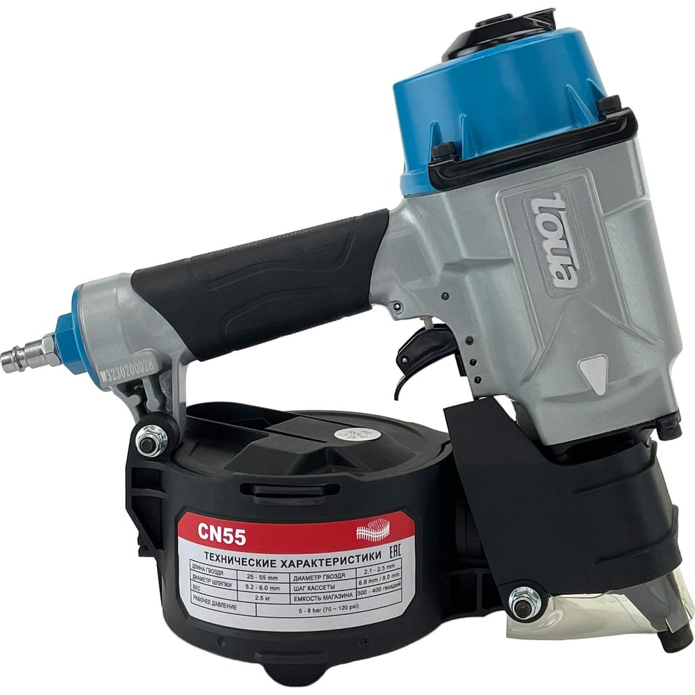 Toua CN55 гвоздезабивной пневматический пистолет барабанного типа работает сгладкими, ершеными и винтовыми гвоздями, соединенными между собой проволокой. Обладает высокой производительностью, большим ресурсом и низкой стоимостью точки крепления. Подходит для работ на производстве и конвейерной сборки. Область применения: паллетное и мебельное производство, производство упаковки и обрешетка грузов.