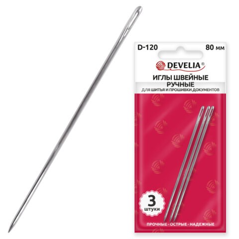 Иглы для шитья и прошивки документов D-120 ручные (цыганские), длина 80 мм, 3 штуки, DEVELIA, 700395