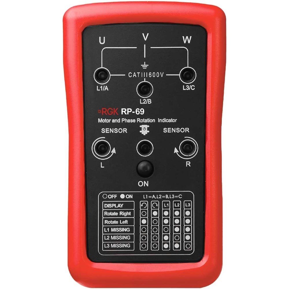 азоуказатель RGK RP-69 - это надежный прибор в ударопрочном корпусе, который в первую очередь ориентирован на специалистов-электротехников, выполняющих обслуживание сетей и установок. Эта модель позволяет быстро провести диагностику трехфазной электросистемы или оборудования, например, электродвигателя. Пользователю доступны следующие функции: определение порядка чередования фаз; индикация направления вращения двигателя; сигнализация о повреждении или неисправности проводника; проверка наличия магнитного поля. Бесконтактный режим. Тестирование электродвигателей производится в беспроводном режиме - достаточно просто поместить прибор на корпус установки, параллельно валу, и посмотреть на сигналы индикаторов. Индикатор чередования фаз RGK RP-69 совместим как с трехфазными, так и с однофазными двигателями за исключением моделей с частотно-регулируемым управлением. Безопасность. Указатель чередования фаз RGK RP-69 относится к третьей категории электробезопасности и протестирован по стандарту CAT III 600 В. Это гарантирует возможность работы с промышленными трехфазными сетями, коммутационным оборудованием, различными электроустановками и др. Все необходимое в комплекте. Устройство готово к работе прямо из коробки т. к. в комплект поставки входят тестовые провода, зажимы типа “крокодил” для подключения к сетям или оборудованию, а также подходящий элемент питания. Также предусмотрен чехол для безопасного хранения и транспортировки указателя последовательности фаз RGK RP-69.