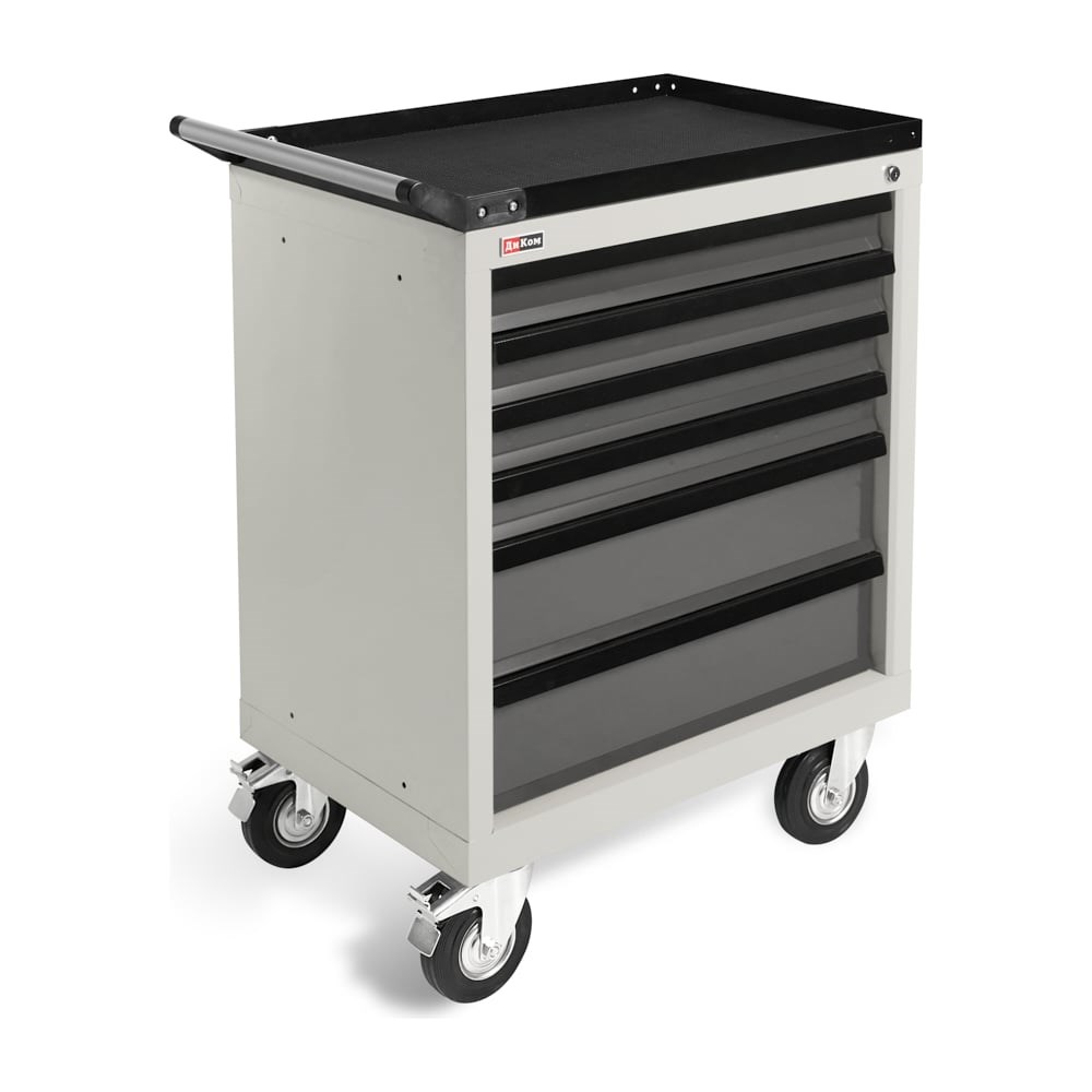 Инструментальная тележка ДиКом TS-875.06 с 6 ящиками создана специально для автосервисов. Четыре малых и два больших сварных ящика закрываются на общий центральный замок EURO-LOCKS (Германия, 10 000 комбинаций). Внутренний размер ящика: 570х400х55/130 мм. Максимальная нагрузка на ящик — 50 кг, на тележку — 300 кг. Тумба-тележка оборудована поворотными колесами диаметром 125 мм, два колеса с тормозом. Сверху установлен металлический лоток с алюминиевой ручкой. Лоток укомплектован ковриком из противоскользящей резины. Гарантия на тележку — 3 года.