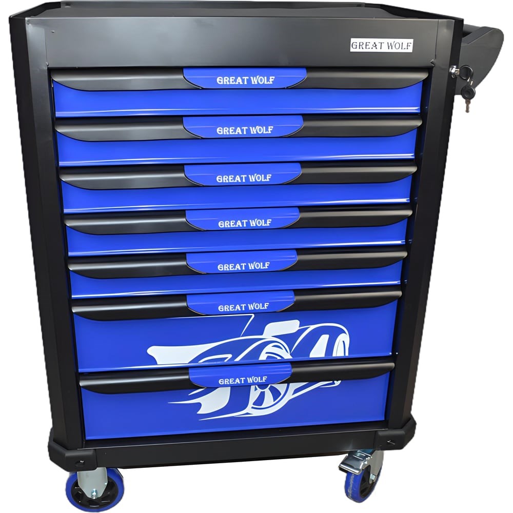 Инструментальная тележка Great Wolf GW-7ST Blue с 7 ящиками и инструментом (249предметов) предназначена для удобного хранения и транспортировки инструмента по ремонтной зоне. Увеличенные колеса с блокирующим механизмом надежно фиксируют тележку на месте. 2 ящика глубиной 130мм и 5 ящиков под ложементы, глубиной 55мм позволяют вместить большое количество инструмента и оборудования. Центральный замок, система против опрокидывания. Допустимая нагрузка более 400кг.