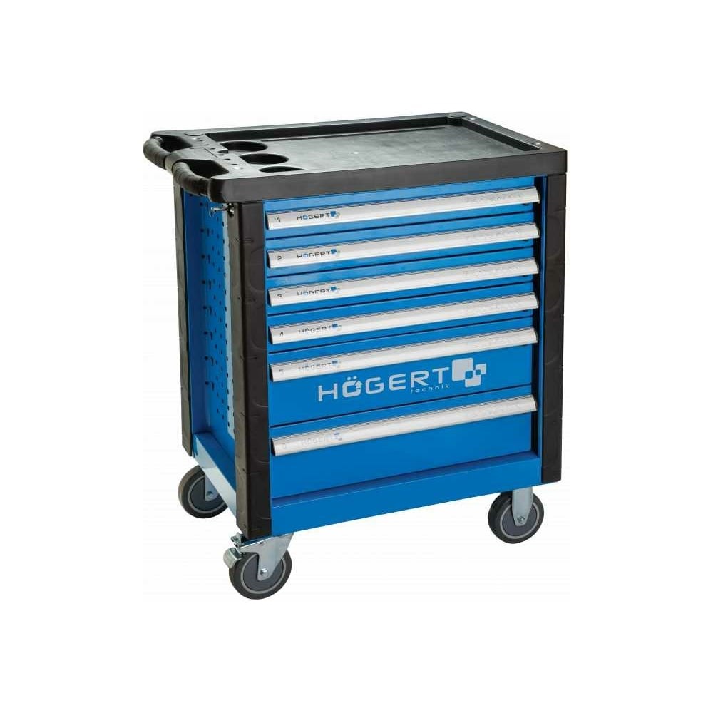 Тележка инструментальная HOEGERT TECHNIK- Организация, мобильность и надежность для профессионалов!Тележка инструментальная HOEGERT TECHNIK HT7G046 – это идеальное решение для хранения и транспортировки инструментов и аксессуаров в профессиональной мастерской, гараже или на производстве. Прочная конструкция и продуманная организация пространства делают эту тележку незаменимым помощником в работе.Преимущества:Оптимальное хранение: 6 выдвижных ящиков (4 высотой 75 мм и 2 высотой 154 мм) позволяют организовать хранение инструментов различных размеров и типов, обеспечивая легкий доступ к необходимым предметам.Надежность и долговечность: Высококачественные направляющие механизмы ящиков обеспечивают плавное и надежное выдвижение ящиков даже при полной загрузке.Безопасность: Блокировка самопроизвольного выдвижения ящиков предотвращает случайное открытие и выпадение инструментов во время перемещения тележки.Легкость перемещения: Колеса из ПВХ диаметром 12,7 см (5”) и шириной 3,2 см (1,25”) с шариковыми подшипниками обеспечивают плавное и легкое перемещение тележки по любой поверхности.Надежная фиксация: Тормоз для блокировки перемещения позволяет зафиксировать тележку в нужном месте, предотвращая ее случайное смещение.Защита от несанкционированного доступа: Замок для закрытия (в комплекте 2 ключа) обеспечивает безопасное хранение инструментов и предотвращает их кражу.Дополнительные возможности хранения: Перфорированные стенки позволяют устанавливать дополнительные аксессуары, такие как крючки и держатели, для еще более эффективной организации рабочего пространства.Прочная и удобная рабочая поверхность: Усиленная столешница из АБС пластика обеспечивает надежную и удобную рабочую поверхность для выполнения различных задач.HOEGERT TECHNIK HT7G046 – это профессиональное решение для организации рабочего пространства, обеспечивающее надежность, мобильность и безопасность ваших инструментов. Инвестируйте в порядок и эффективность!