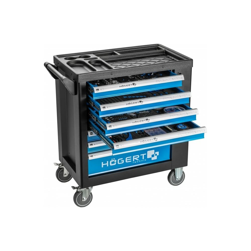 HOEGERT TECHNIK HT7G050: Инструментальная тележка с 7 ящиками и 544 инструментами – ваш мобильный арсенал для профессиональной работы! Эта инструментальная тележка – это комплексное решение для хранения, организации и транспортировки инструментов, разработанное для профессионалов, работающих в автомастерских, ремесленных мастерских и других сферах. Благодаря прочной конструкции, мобильности и богатой комплектации из 544 инструментов, эта тележка станет вашим незаменимым помощником. Высота тележки с колесами – 89,5 см без колес 74,5 см Преимущества: Большая комплектация: 544 тщательно подобранных инструмента, необходимых для выполнения широкого спектра задач. Оптимальная организация: 7 выдвижных ящиков различной высоты (6 ящиков выс. 50 мм, 1 ящик выс. 130 мм) для удобного размещения инструментов разного размера. Индивидуальные замки на каждом ящике предотвращают их случайное открытие во время перемещения. Возможность полного открытия ящиков обеспечивает легкий доступ к инструментам. Шарикоподшипниковые направляющие ящиков гарантируют плавное и надежное открывание даже при высоких нагрузках. Дополнительное место для хранения: Боковой отсек с закрывающейся дверцей и полкой идеально подходит для хранения банок, бутылок и других предметов, которые необходимо держать в вертикальном положении. Мобильность и маневренность: 4 колеса TPR размером 5x1,25” с шариковыми подшипниками обеспечивают плавный ход и легкое перемещение тележки. Два поворотных колеса с тормозами позволяют надежно зафиксировать тележку на месте. Надежная защита: Блокировка шкафа с двумя ключами защищает инструменты от кражи и предотвращает открытие ящиков во время транспортировки. Прочная и удобная столешница: Усиленная столешница из полипропилена с отделениями для разделения мелких деталей. Высокая грузоподъемность: Максимальная нагрузка на малые ящики - 15 кг, на глубокий ящик - 25 кг. HOEGERT TECHNIK HT7G050 – это ваша мобильная мастерская, которая обеспечит организованное хранение, надежную защиту и удобную транспортировку ваших инструментов, позволяя вам работать эффективно и профессионально в любом месте!