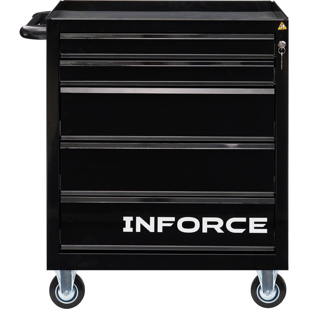 Инструментальная тележка Inforce 5 ящиков, габариты без упаковки 745х465х825мм 06-01-14 подходит для любых видов работ. Конструкция обеспечивает удобство организации рабочего места. Модель состоит из 5 ящиков для упорядоченного размещения инструмента. С помощью колес и ручки тележка легко и быстро перемещается по рабочей площадке. Верх конструкции покрыт резиновым материалом, который препятствует скольжению рабочего инструмента. Толщина металла составляет 0.8 мм. Ширина и глубина каждого ящика составляет 565х415 мм. Высота ящиков сверху вниз соответственно: 65, 65, 145, 145, 145 мм. Диаметр колес 100 мм, нагрузка 100 кг.