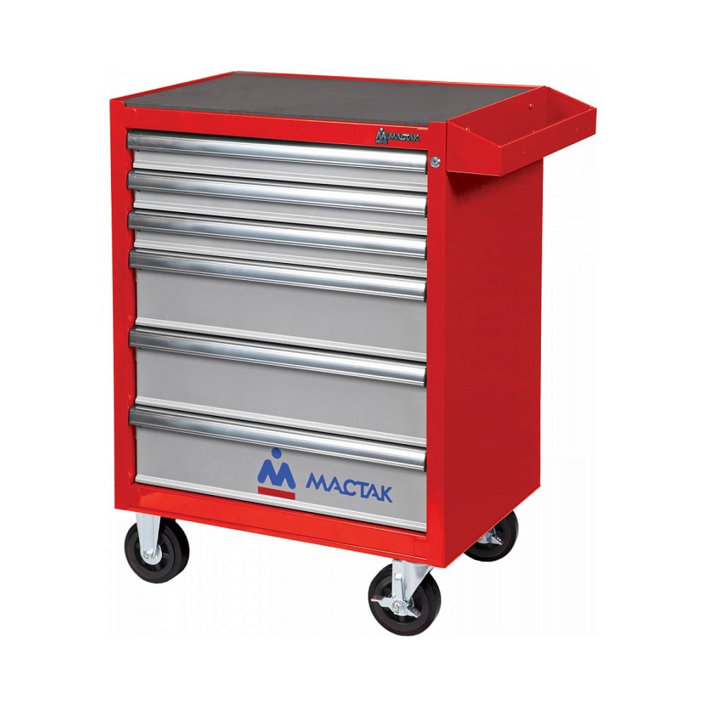 Инструментальная тележка МАСТАК серии ОПТИМА, 6 полок, красная 521-06581MR выполнена из листового металла на прочном и жестком каркасе. Конструкция выдерживает значительную нагрузку. Ее не перекашивает при движении по неровным поверхностям. Удобная рукоять упрощает перемещение. Она монтируется по ширине тележки и позволяет легко маневрировать. Поворотные колеса дополнительно оснащены стопором, который облегчает стабилизацию тележки. Каждый ящик оборудован удобной рукояткой для извлечения. Большое количество ящиков позволяет удобно систематизировать инструмент. Это упрощает его хранение и обеспечивает более быструю работу в автомастерской.